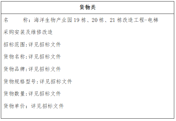 一、项目名称:海洋生物产业园19栋、20栋、21栋改造工程-电梯采购安装及维修改造