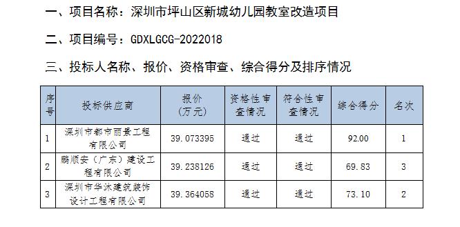 深圳市坪山区新城幼儿园教室改造项目中标(成交)结果公告
